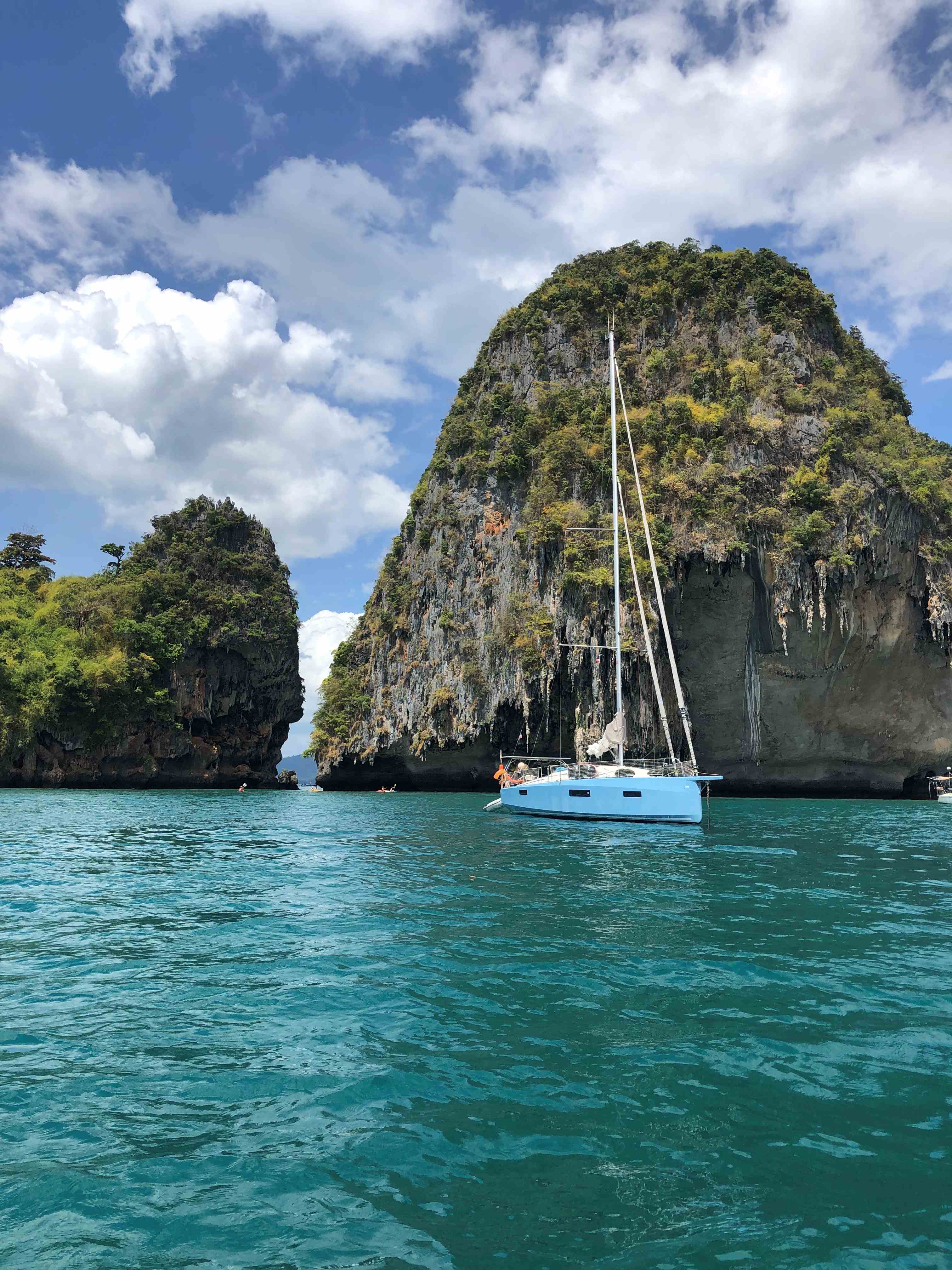 Après un dernier week-end de préparatifs (dernier marché, cuisine, rangement et derniers bricolages), on quitte Phuket en fin de matinée, bord à bord avec nos amis de Taravana.