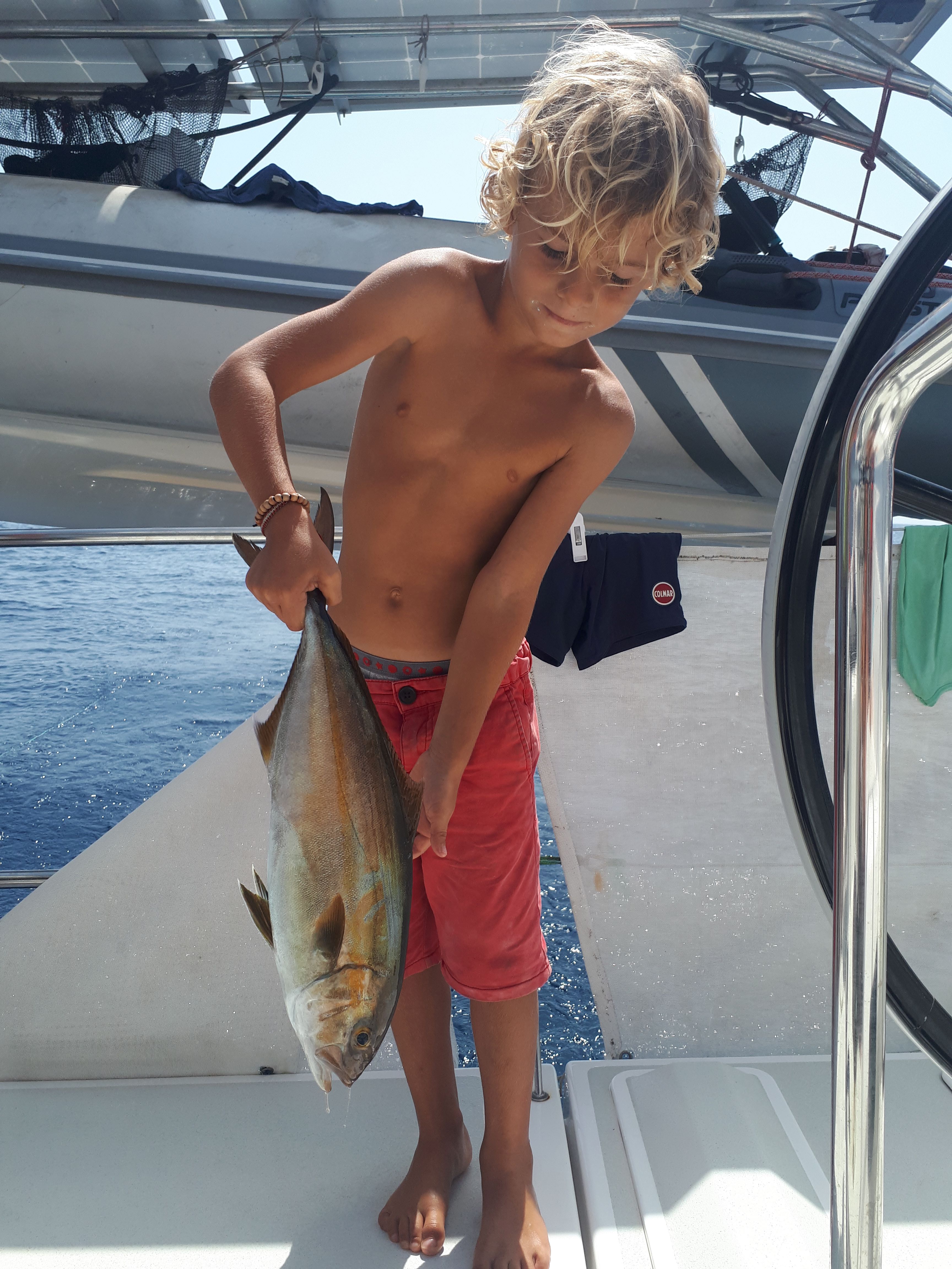 Ah si, quelques calamars kamikazes finissent parfois sur le pont (mais jamais assez pour nous assurer un repas malheureusement), et toujours les éternels poissons volants. Titouan a même la chance d’en avoir un qui atterrit dans son lit au milieu de la nuit !
